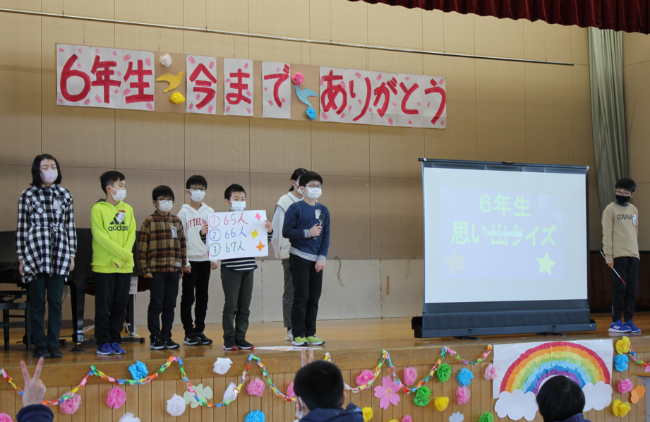 「6年生を送る会」を行いました。5年生を中心に各学年が6年生に感謝の気持ちを伝えようと、飾りつけや似顔絵作り、出し物の練習など準備をがんばってきました。今日、本番の発表では、感謝の気持ちが6年生に伝わったことと思います。これまでの6年生の姿から、よい伝統を引き継ぎ、ますます米子小学校をよくしていこうという在校生の思いをひとつにする会にもなりました。