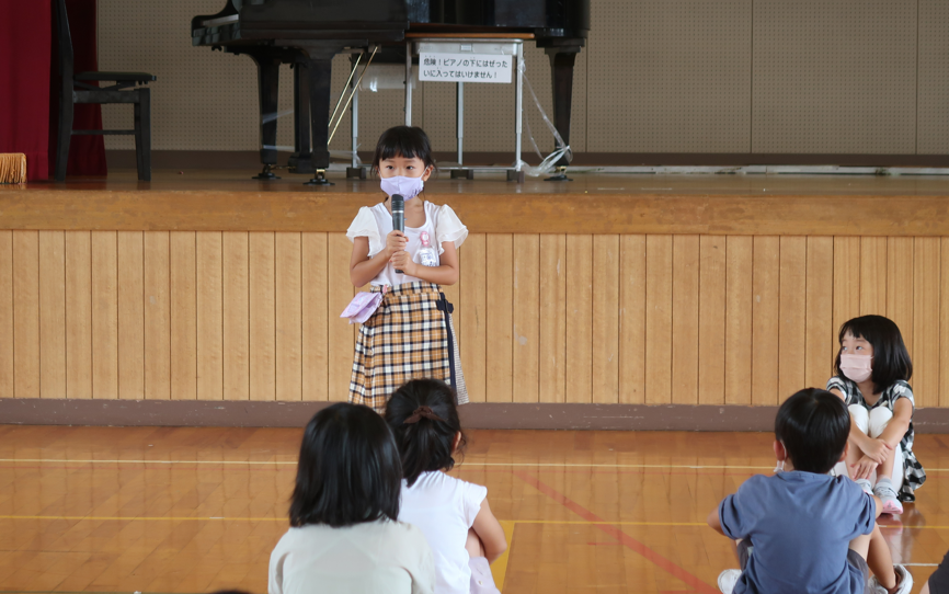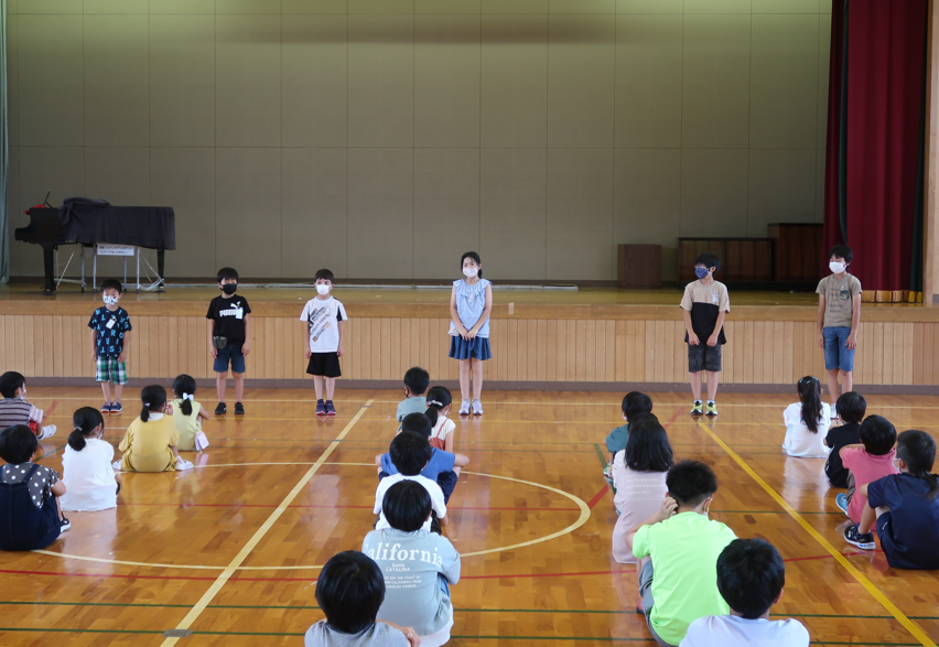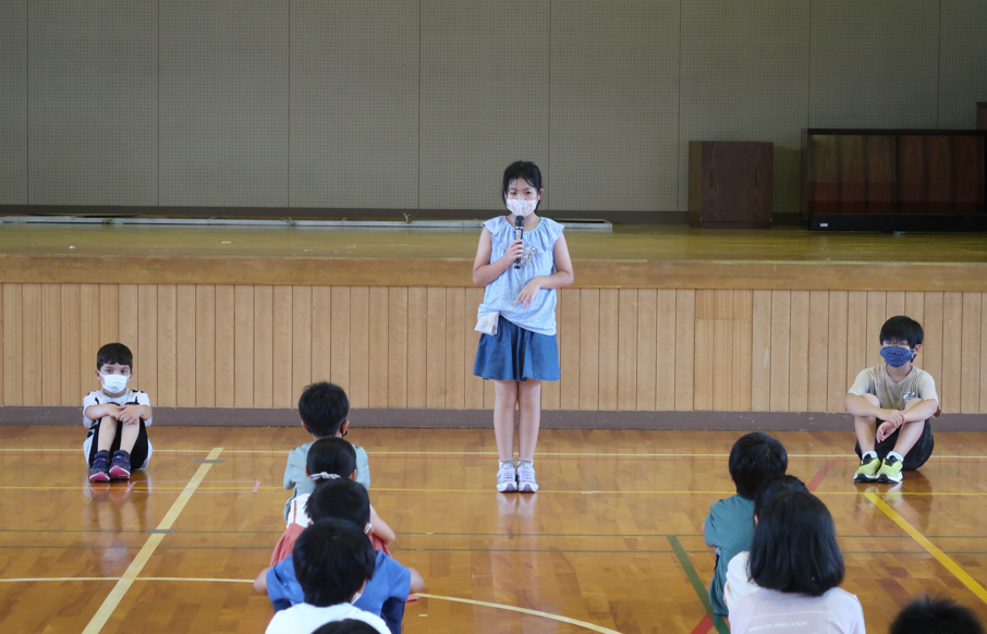 本日、1学期終業式を行いました。各学年の代表児童6名が「1学期にがんばったこと」と「夏休みの楽しみ」について発表しました。どの子もすばらしい態度で発表することができました。これから夏休みになります。子どもたちが楽しく充実した夏休みを過ごせるよう、ご配慮ください。