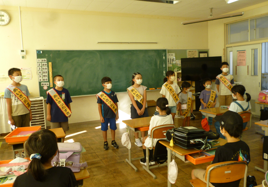 夏休みが終わり、学校に子どもたちの元気な声が戻ってきました。本日、2学期始業式を行いました。1〜6年生の代表児童6名が「夏休み楽しかったこと」と「2学期にがんばりたいこと」を発表しました。話の内容から、充実した夏休みを過ごしていたことが伝わってきました。9月の生活目標は「気持ちのよいあいさつをしよう」です。それに伴い、5日(月)から「あいさつたすきプロジェクト」が始まります。明るく元気なあいさつが米子小学校中に響いてほしいなと思っています。